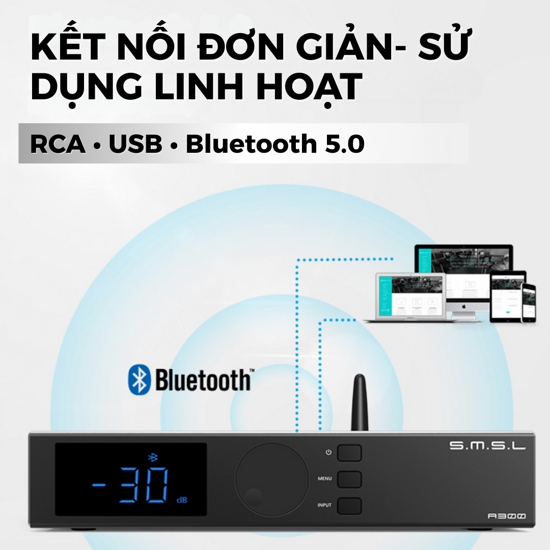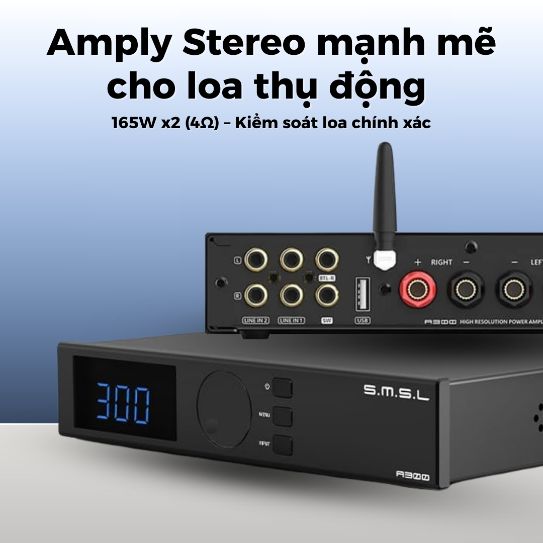 SMSL A300 là dòng amply kỹ thuật số hiệu suất cao sử dụng công nghệ tiên tiến từ Đức. Điểm độc đáo của A300 là khả năng chuyển đổi sang chế độ BTL (Bridge) để đạt công suất lên tới 330W, đủ sức kéo những cặp loa cột cỡ lớn một cách dễ dàng.