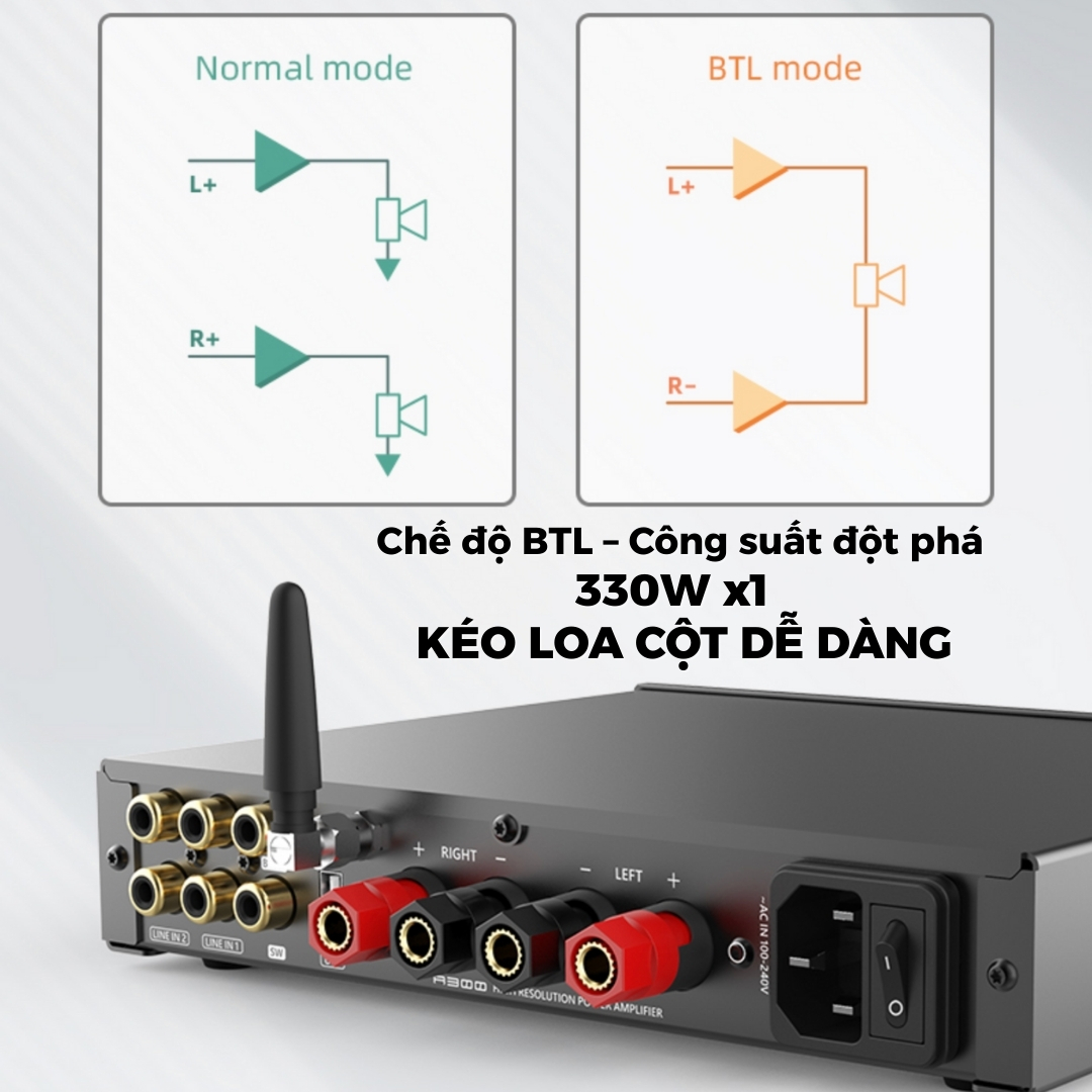 Chế độ BTL mạnh mẽ: Có thể kết nối cầu (Bridged) để biến thành amply đơn kênh với công suất 330W (4-8Ω).