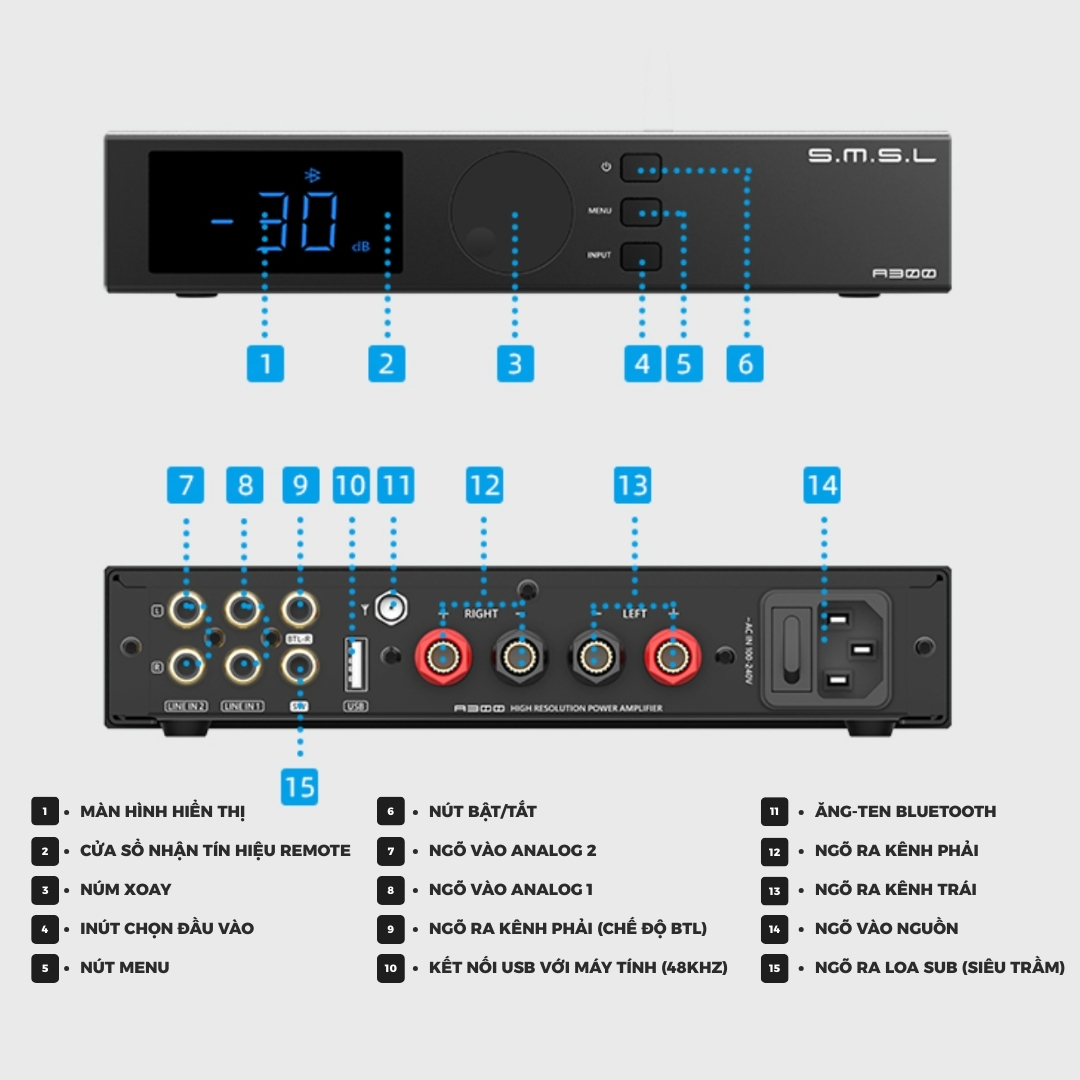 Đầu vào: RCA, Bluetooth, USB (Hỗ trợ 48kHz).