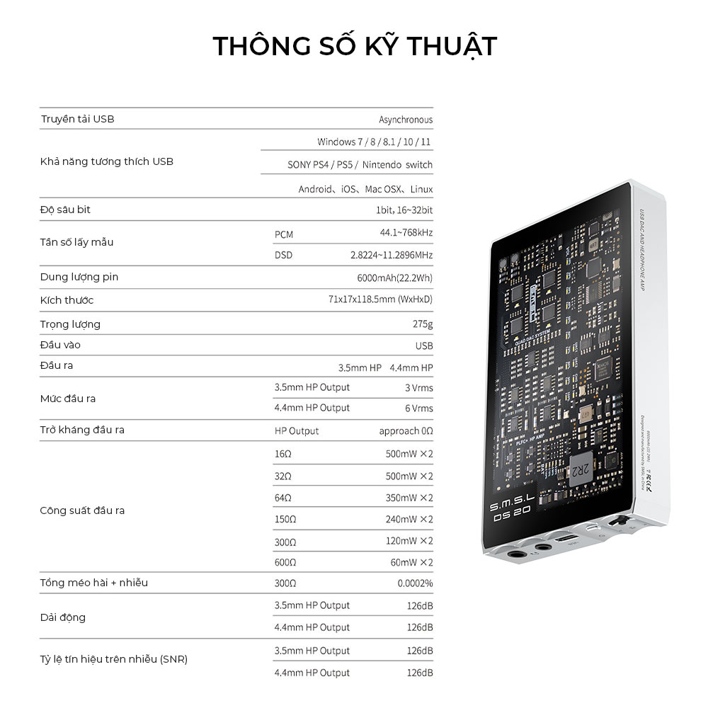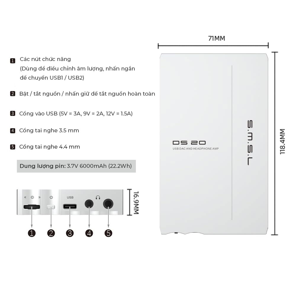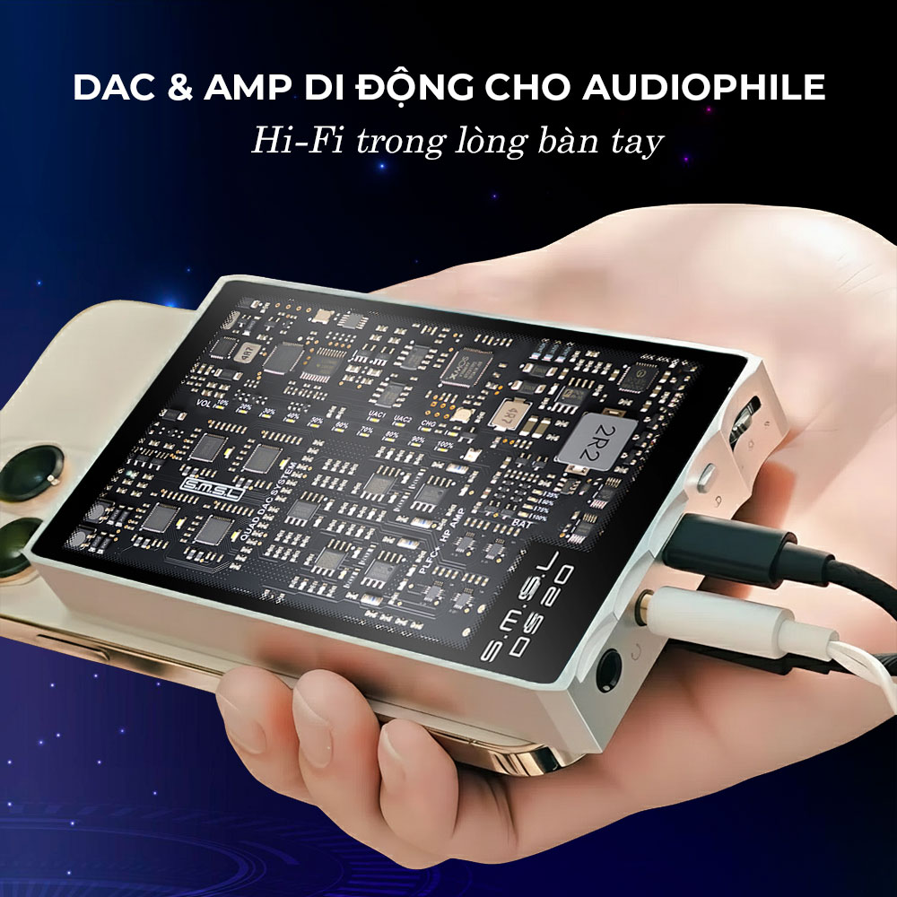 SMSL DS20 là thiết bị DAC + headphone amplifier cầm tay chất lượng cao, thiết kế nhỏ gọn, hiệu năng mạnh mẽ để nâng cấp chất lượng âm thanh từ thiết bị số (máy tính, điện thoại, máy chơi game) đến tai nghe bất kỳ — kể cả tai nghe trở kháng cao.