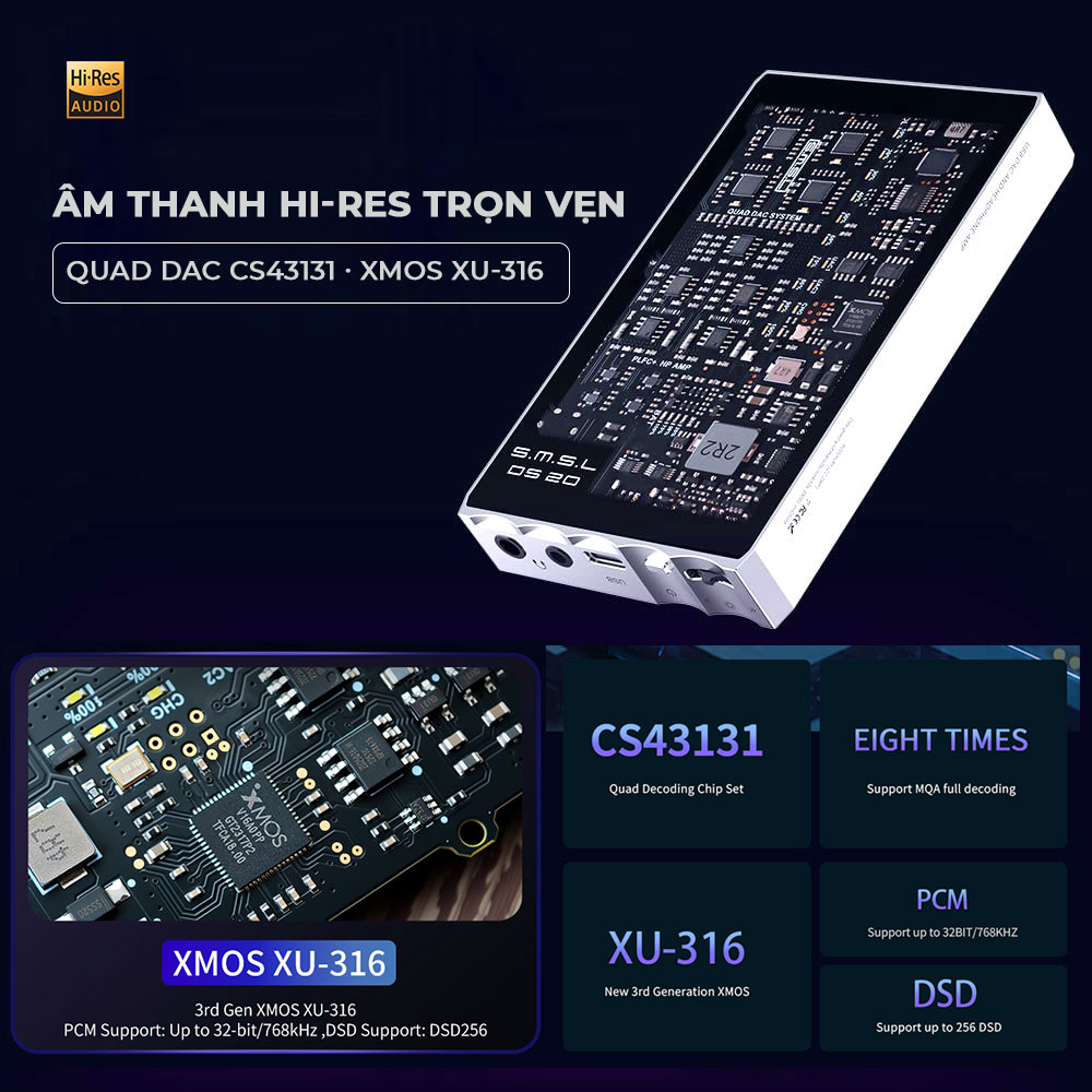 USB chip: XMOS XU-316 thế hệ mới, xử lý tín hiệu số nhanh, hỗ trợ truyền USB asynchronous cho chất lượng tốt nhất.
