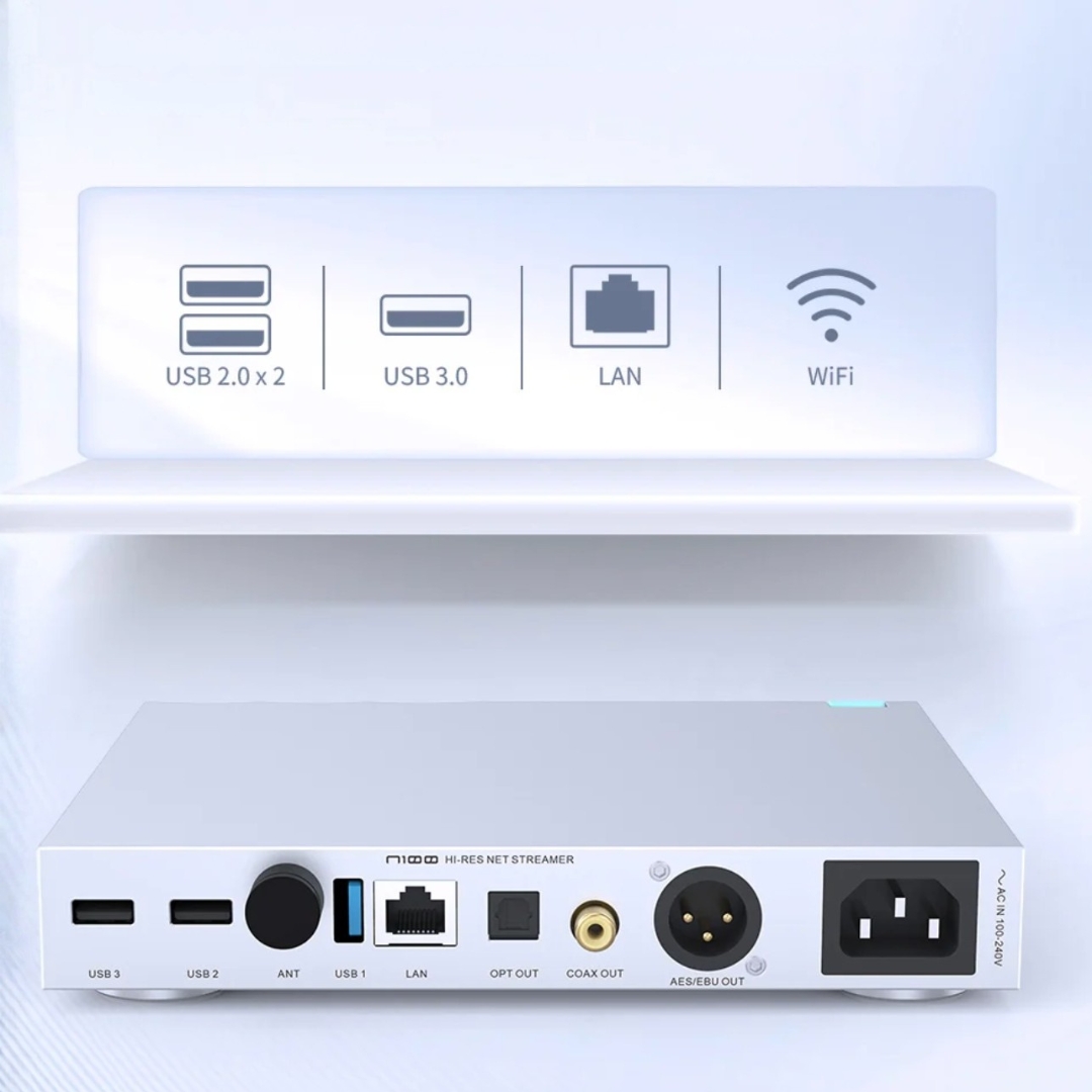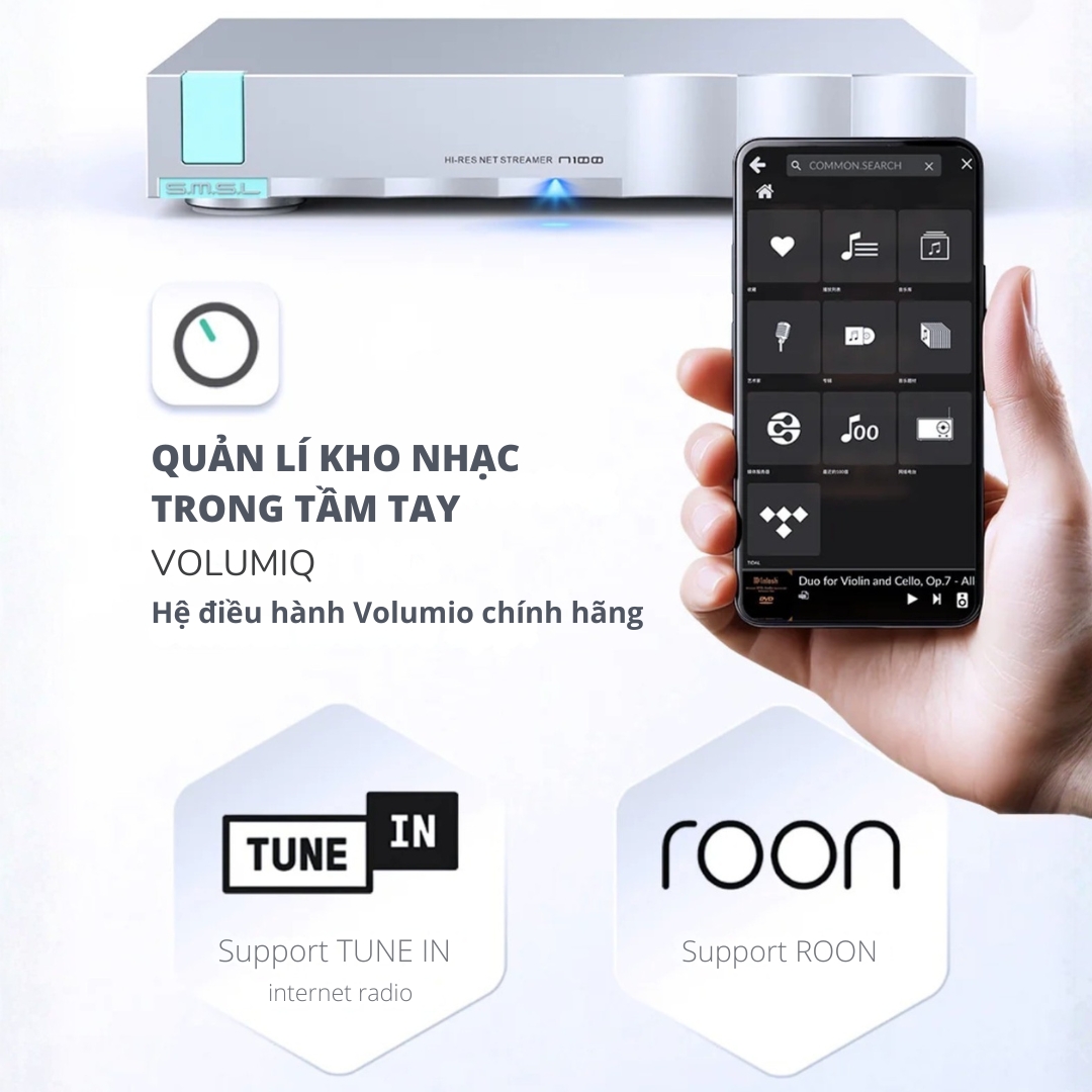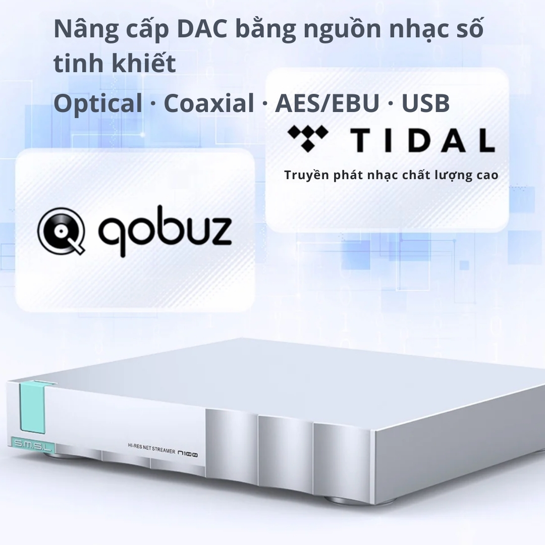 Sản phẩm sở hữu thiết kế vỏ nhôm CNC sang trọng, tích hợp bộ nguồn nhiễu thấp chuẩn âm thanh. Không chỉ dừng lại ở việc stream nhạc từ các nền tảng trực tuyến như Tidal, Qobuz, Spotify, SMSL N100 còn hỗ trợ kết nối ổ cứng ngoài và ổ đĩa CD rời qua cổng USB, biến nó trở thành trung tâm giải trí đa năng. Với khả năng hỗ trợ Roon Ready, Airplay và DLNA, đây là lựa chọn nâng cấp hoàn hảo cho những tín đồ Audiophile yêu thích sự tiện lợi nhưng không thỏa hiệp về chất lượng âm thanh.