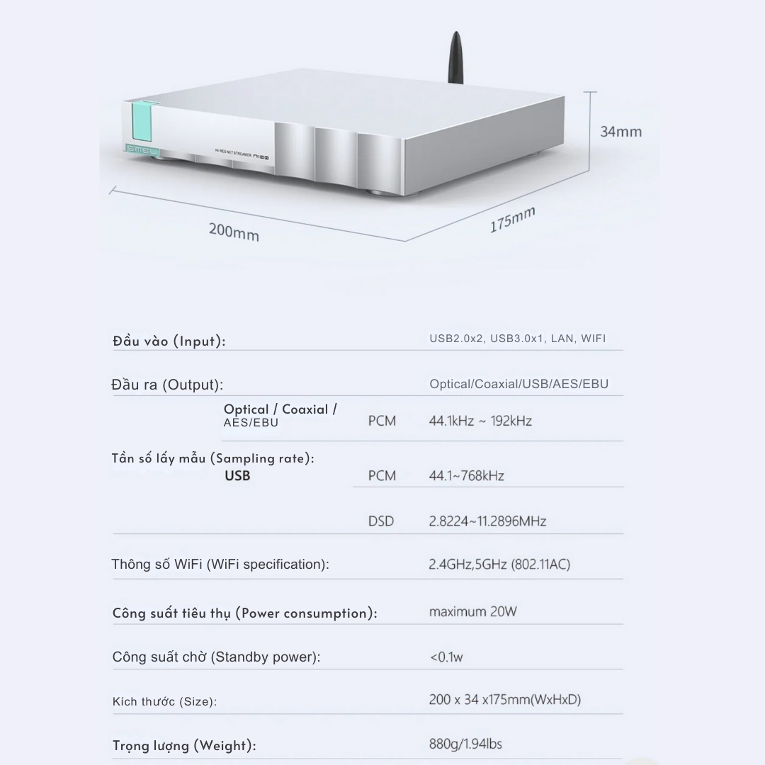 SMSL N100 là thiết bị truyền tải nhạc số (Network Streamer) cao cấp, được thiết kế để mang lại trải nghiệm âm thanh Hi-Res tuyệt đỉnh cho hệ thống nghe nhạc gia đình. Với sự hợp tác chính thức từ Volumio (Ý), N100 cho phép bạn quản lý kho nhạc khổng lồ một cách mượt mà qua ứng dụng điện thoại.