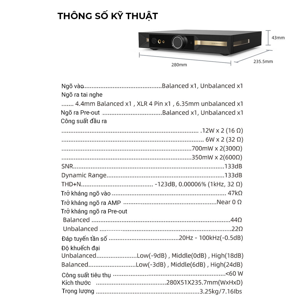 Công suất siêu khủng (High Power Output): Đạt mức 12W tại 16 $\Omega$ và 6W tại 32 $\Omega$, đủ sức "trị" mọi dòng tai nghe Planar Magnetic (tai nghe từ phẳng) cứng đầu nhất.