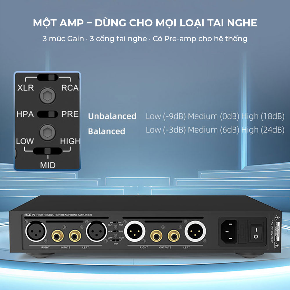 Thiết kế Gain 3 tầng chuyên biệt: Có chế độ Low Gain được tối ưu hóa đặc biệt cho các dòng tai nghe In-ear (IEM) nhạy cảm, loại bỏ hoàn toàn tiếng nhiễu nền (hiss).