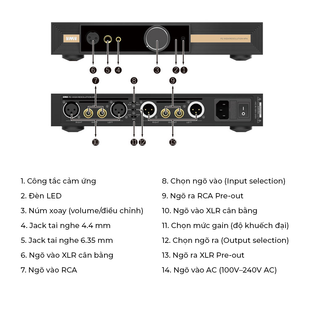 Đầu ra Pre-amp: XLR Balanced, RCA Unbalanced