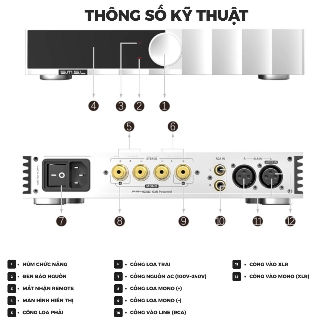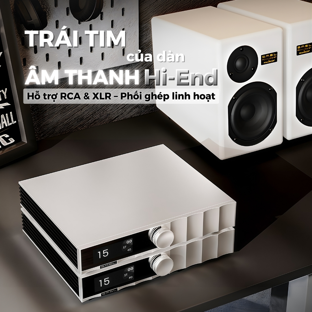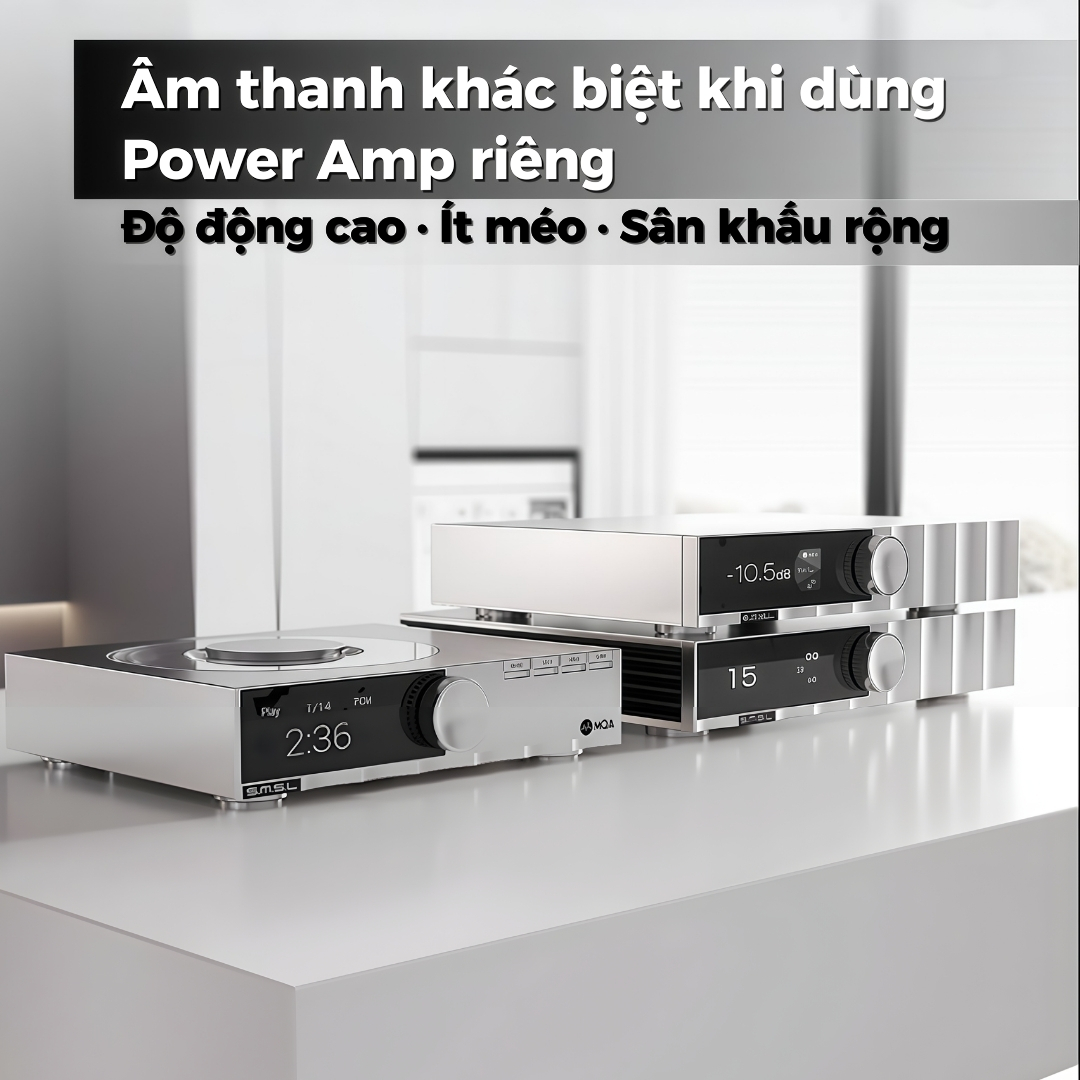 Sản phẩm được trang bị chip âm lượng hàng đầu TI PGA2311, cho phép kiểm soát âm lượng chính xác tuyệt đối và duy trì độ trung thực của bản nhạc. Dù bạn sử dụng chế độ Stereo để thưởng thức âm thanh tách bạch hay chế độ Mono BTL để bùng nổ công suất lên đến 500W, SMSL PA400 vẫn là "trái tim" hoàn hảo cho mọi dàn âm thanh cao cấp, dễ dàng phối ghép với các thiết bị như DAC D400PRO và đầu CD PL200.