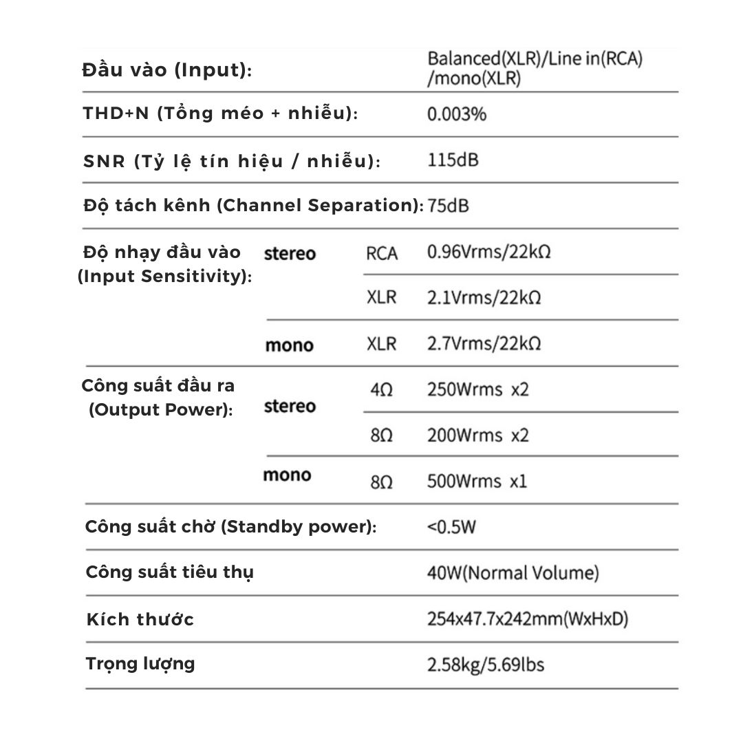 Công suất đầu ra (Stereo),250W x 2 (4Ω) / 200W x 2 (8Ω)
