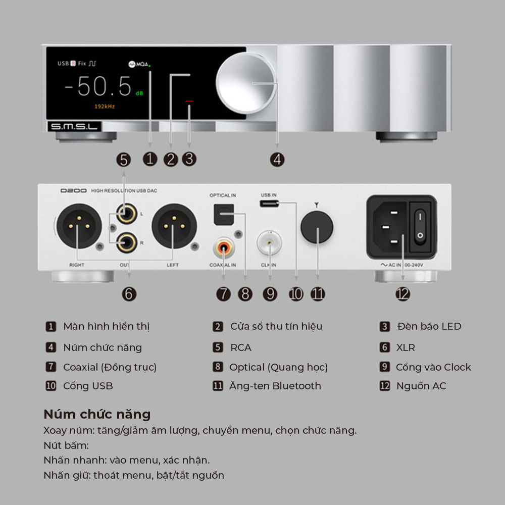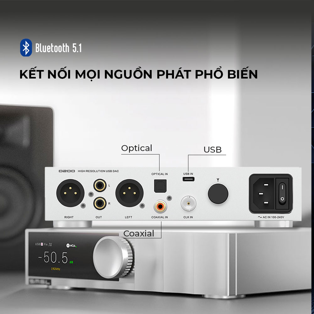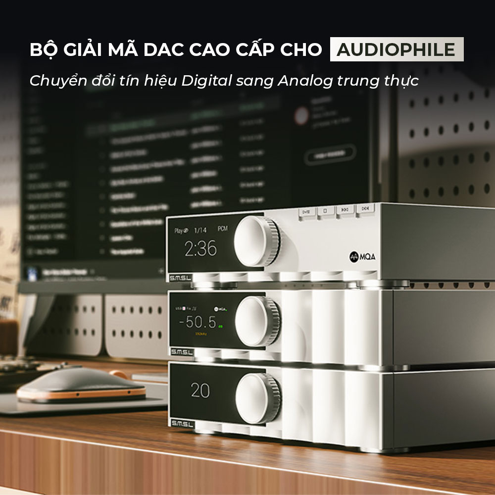 Giải mã MQA toàn diện: Hỗ trợ giải mã MQA và MQA-CD qua tất cả các cổng đầu vào kỹ thuật số (USB, Optical, Coaxial).